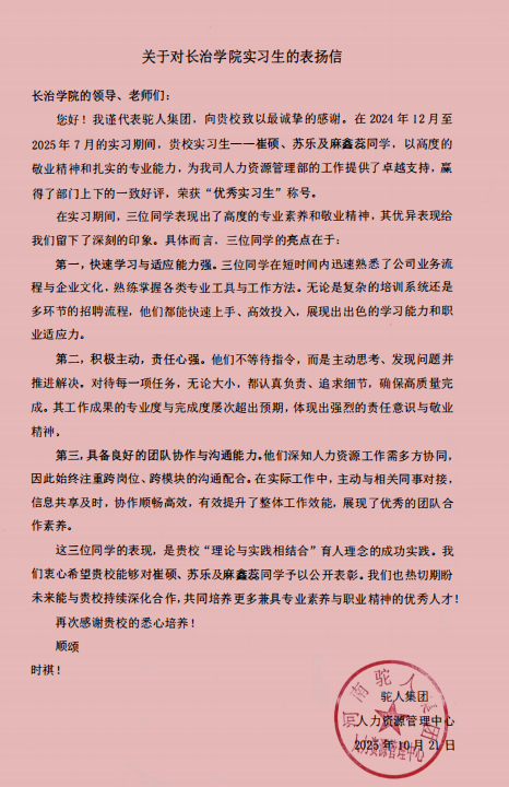 我系学子展风采,驼人集团致表扬——实习生获合作企业高度认可近日...