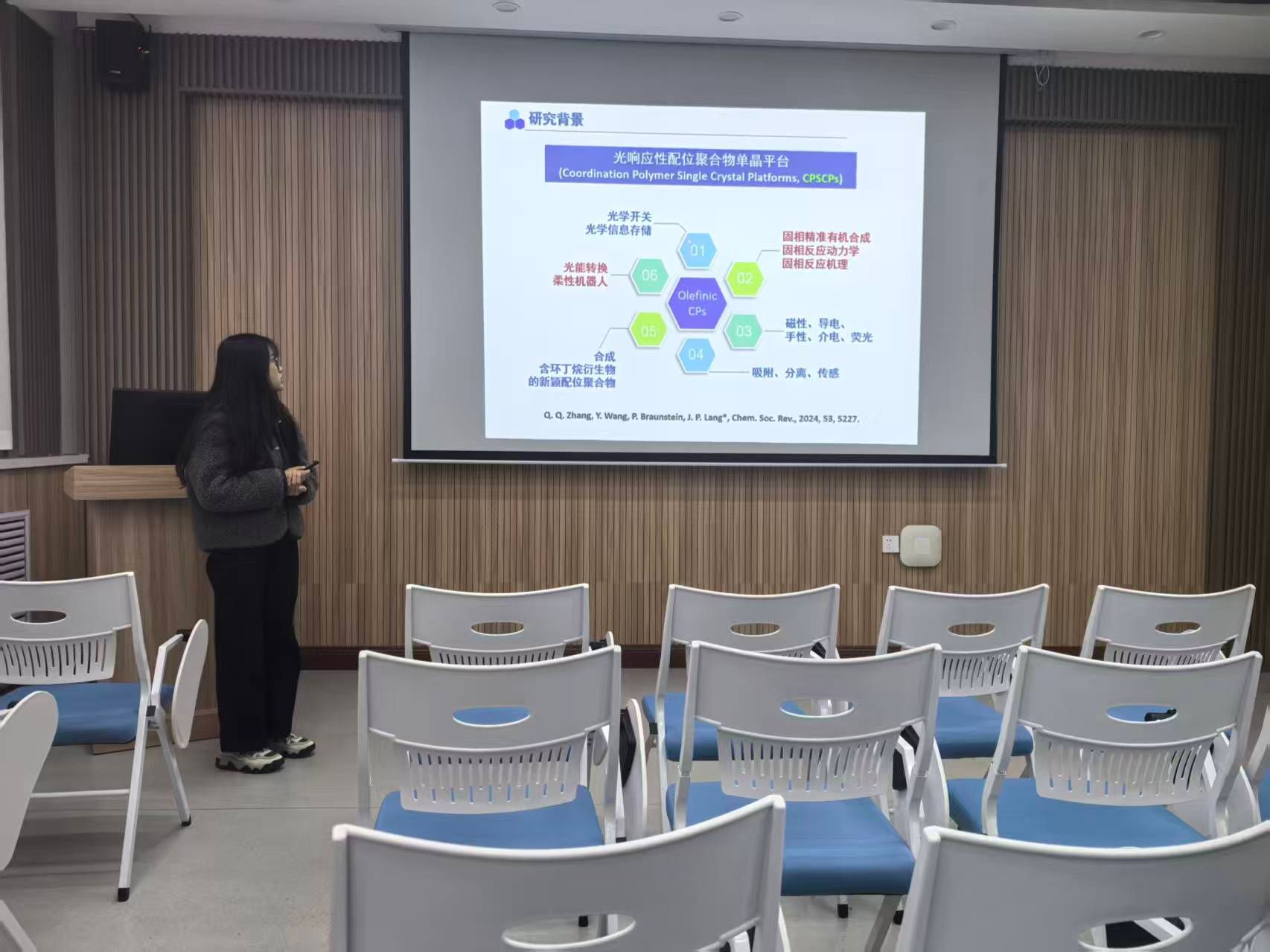 报告中,张巧巧博士系统介绍了配位聚合物晶态材料在光化学领域的最新进展。她重点从三个方面展开:在精准合成方面,阐述了如何利用该单晶平台,引导烯烃配体在固态下以高选择性发生[2+2]光环加成反应,实现“从单晶到单晶”的定向转化,高效合成环丁烷衍生物。在智能响应方面,探讨了利用光反应引发的晶格畸变开发光致机械材料(如光致动器)的潜力,并分析了反应前后光致发光等性质的变化。在机理探索方面,分享了借助原位X射线衍射与荧光光谱技术,实时监测反应过程、捕获中间体,从而深入揭示固态光化学反应机理的突破性工作。