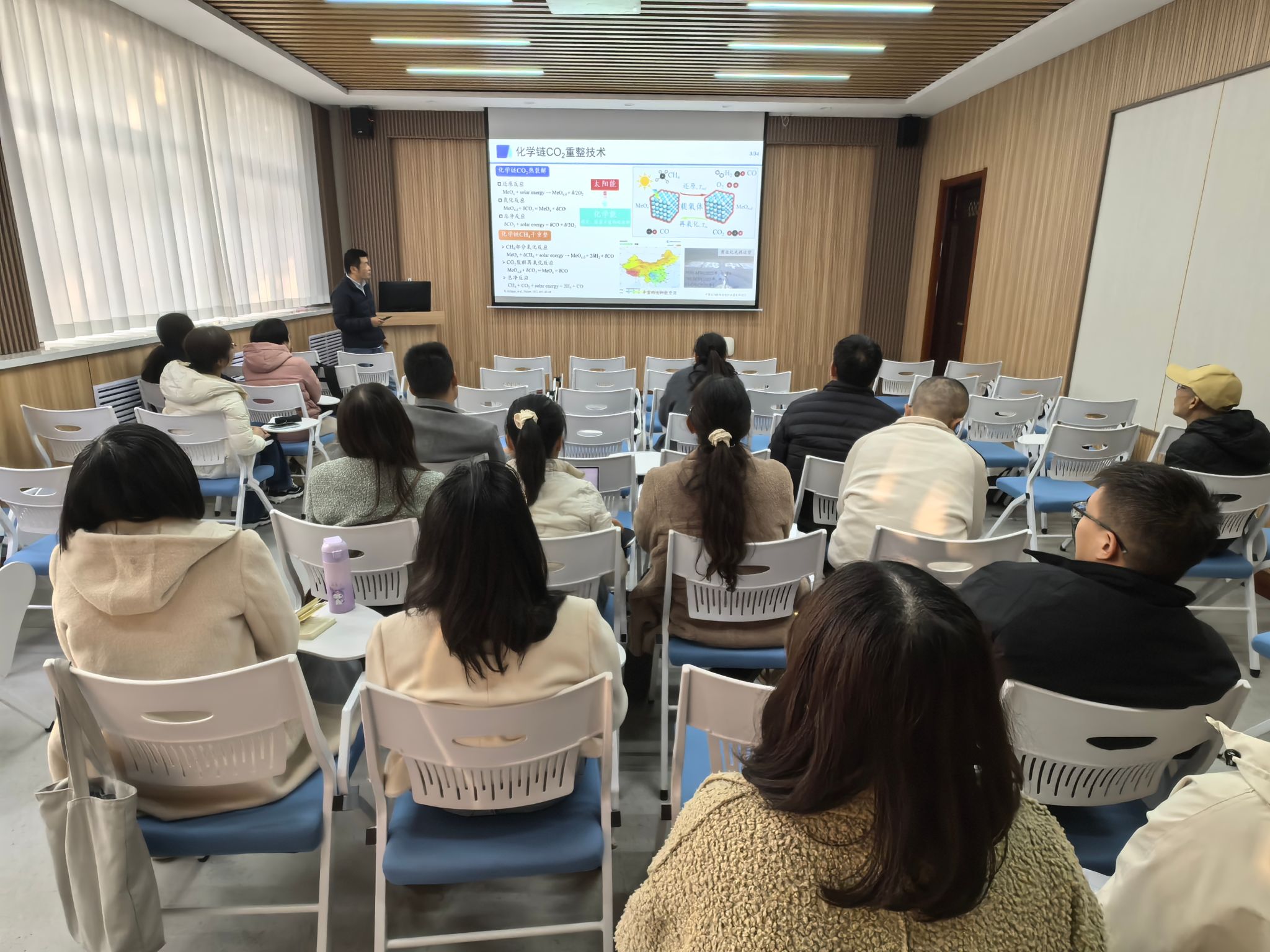 能源化学工程教研室杨柳青博士作题为“太阳能化学链转化CO2和CH4的铁酸锶基载氧体性能优化研究”的专题报告。在报告中,杨柳青博士系统介绍了其在太阳能驱动化学链技术领域取得的创新成果。研究聚焦高性能铁酸锶基载氧体开发,致力于实现CO2和CH4的高效资源化转化。报告从四个维度展开:通过B位掺杂调控材料释氧与CO2吸附性能;运用双掺杂策略实现表面纳米化提升氧化还原活性;采用Ni修饰表面增强CH4还原能力;通过形貌调控显著改善材料循环稳定性。