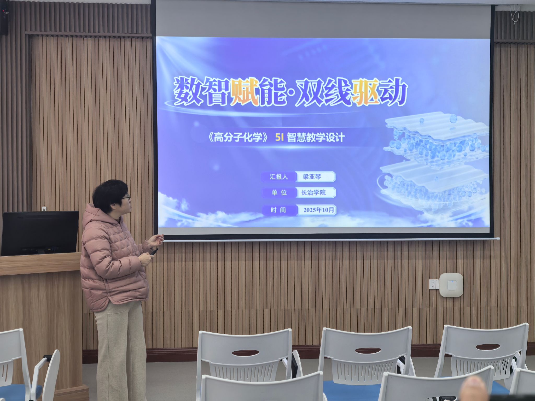 化学教研室梁亚琴教授作题为“数智赋能·双线驱动——高分子化学5I 智慧教学设计”的专题报告,报告中,梁亚琴教授立足于多年的教学实践与研究,系统而深入地分享了其在高分子化学智慧课程建设方面的创新成果与独到思考。她的介绍主要围绕三大核心板块层层展开: