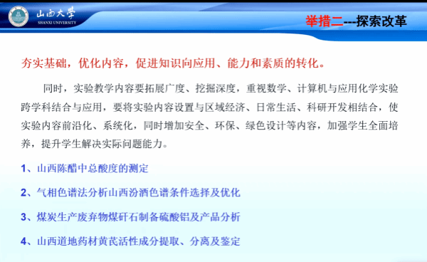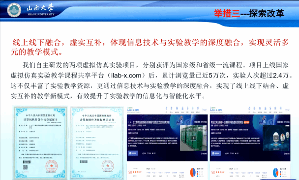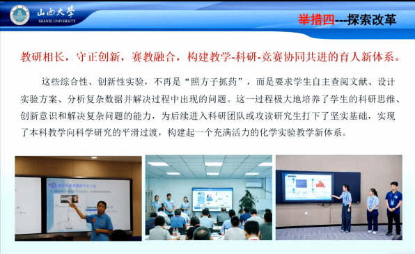 在实验内容重组与创新方面,郝教授重点介绍了将实验体系整合为“基础-综合”两个层次的改革实践。其中,综合实验不仅涵盖二级学科内的综合训练,更拓展至跨学科融合,旨在打破学科壁垒,拓宽学生学术视野。他还分享了将实验教学与地方经济特色相结合的成功经验,通过巧妙引入山西本土资源,既激发了学生的学习兴趣,也增强了实验教学的实用性与区域针对性,实现了人才培养与地方产业需求的有机衔接。